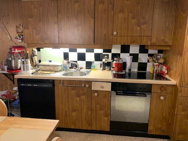 Die Küche ist für in die Mulde nach 46Jahren, hat sie ihren Dienst getan.. Jede Schublade und Türe hat Spiel. Wasserhahn tropft, Kombination und Chromstahl sind Matt,die Platzverhältnisse und Arbeitsfläche werden Unerträglich..Die Orangenen Plättli mussten im Zielflaggenmuster geklebt werden, so dass man wenigstens mit dem Kochen noch einigermassen ins Ziel kommt...