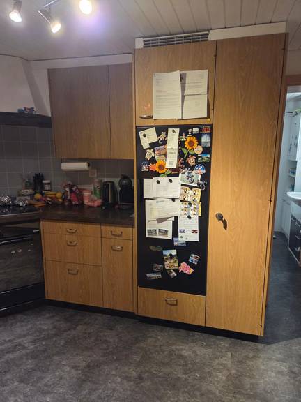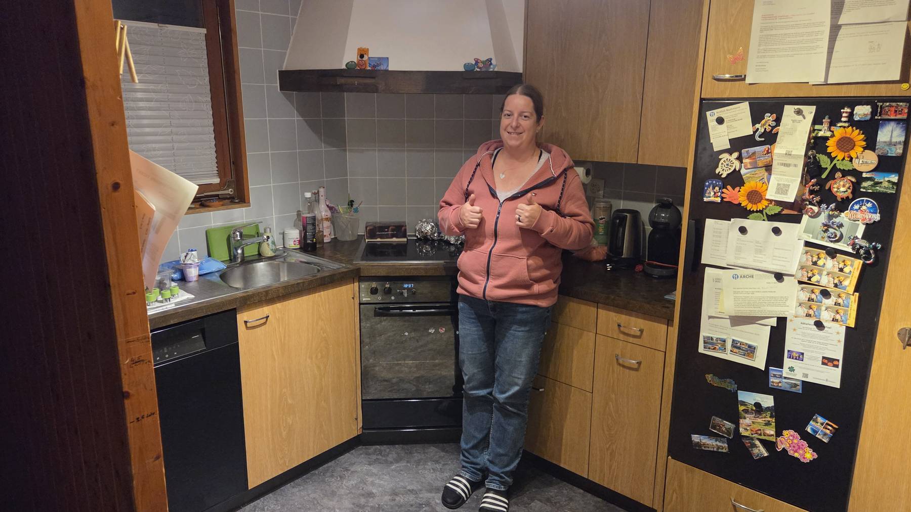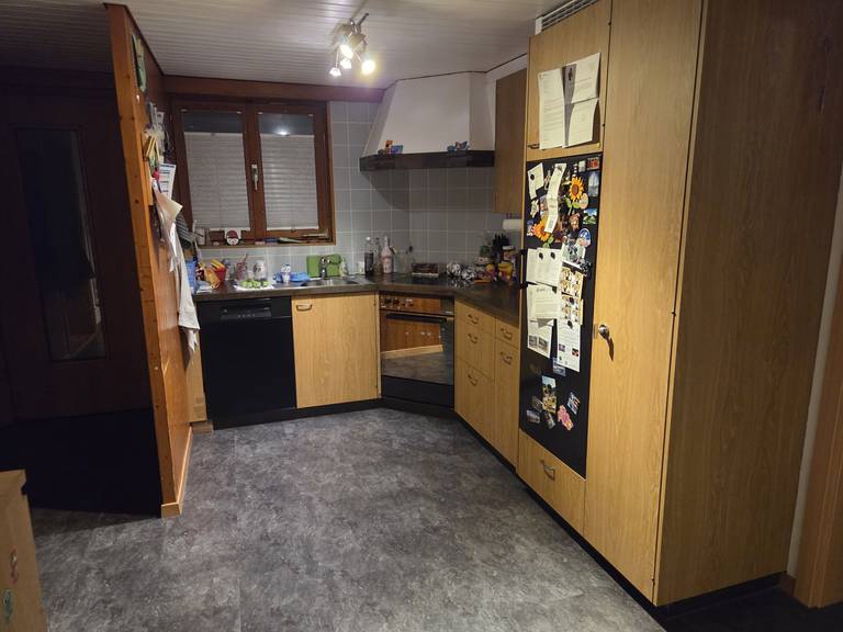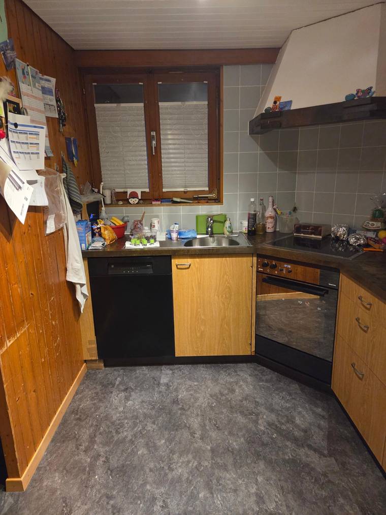 Unsere Küche entspricht nicht mehr den heutigen Vorstellungen. Sie ist zu klein, dunkel und die Kinder haben ein paar Schäden an den Schränken hinterlassen. Leider ist immer alles überstellt weil der Stauraum fehlt. Die Roten Plättli an der Rückwand haben wir schon mal mit Kleber abgedeckt, damit die Küche etwas moderner wirkt.